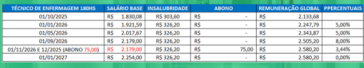 Os Técnicos e Auxiliares de Enfermagem terão reajustes escalonados com aumentos graduais até janeiro de 2027: