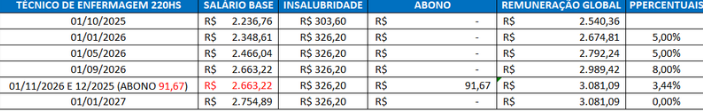 A remuneração global parte de R$ 2.540,36 (out/2025) e evolui com os mesmos percentuais de reajuste, alcançando R$ 3.081,09 em janeiro de 2027.
